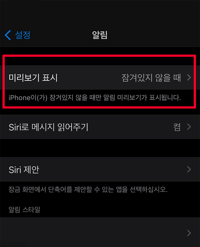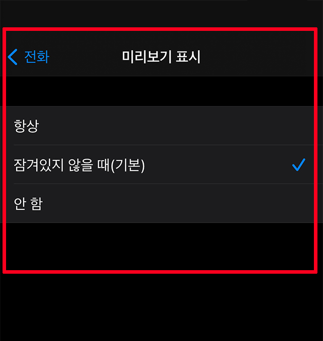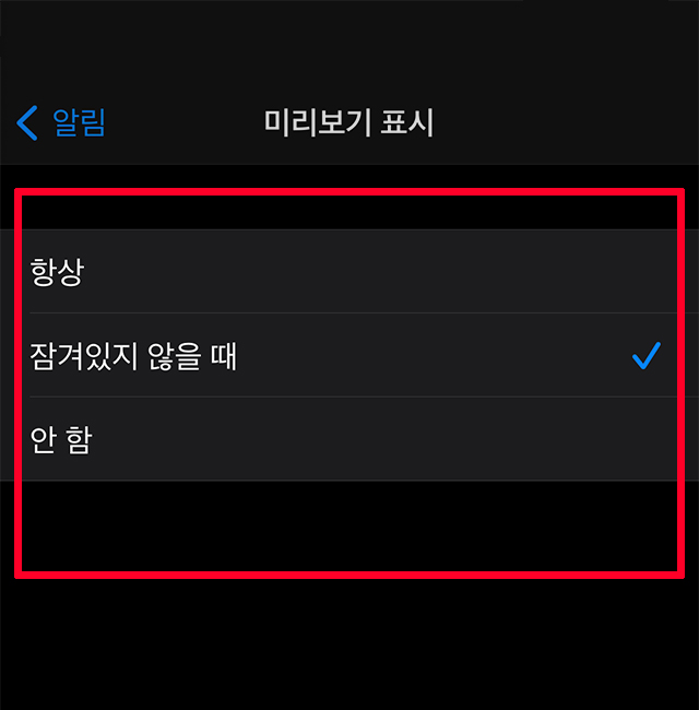 하단에 있는 2가지 항목 중에 하나였던 <미리보기 표시> 의 선택 가능한 옵션으로는 “항상” 표시되는 선택과 <잠겨있지 않을 때> 의 기본 설정 그리고 필요하지 않은 앱에서 선택할 수 있는 “안 함” 의 3가지 선택 옵션을 제공하고 있습니다