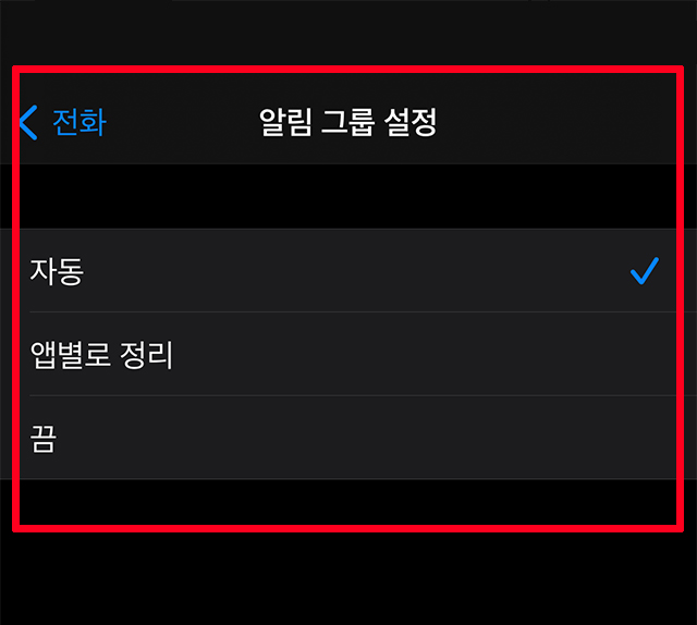 <알림 그룹 설정> 에서는 <자동>, <앱별로 정리> 그리고 <끔> 의 옵션 중에서 사용자의 선택으로 변경할 수 있습니다