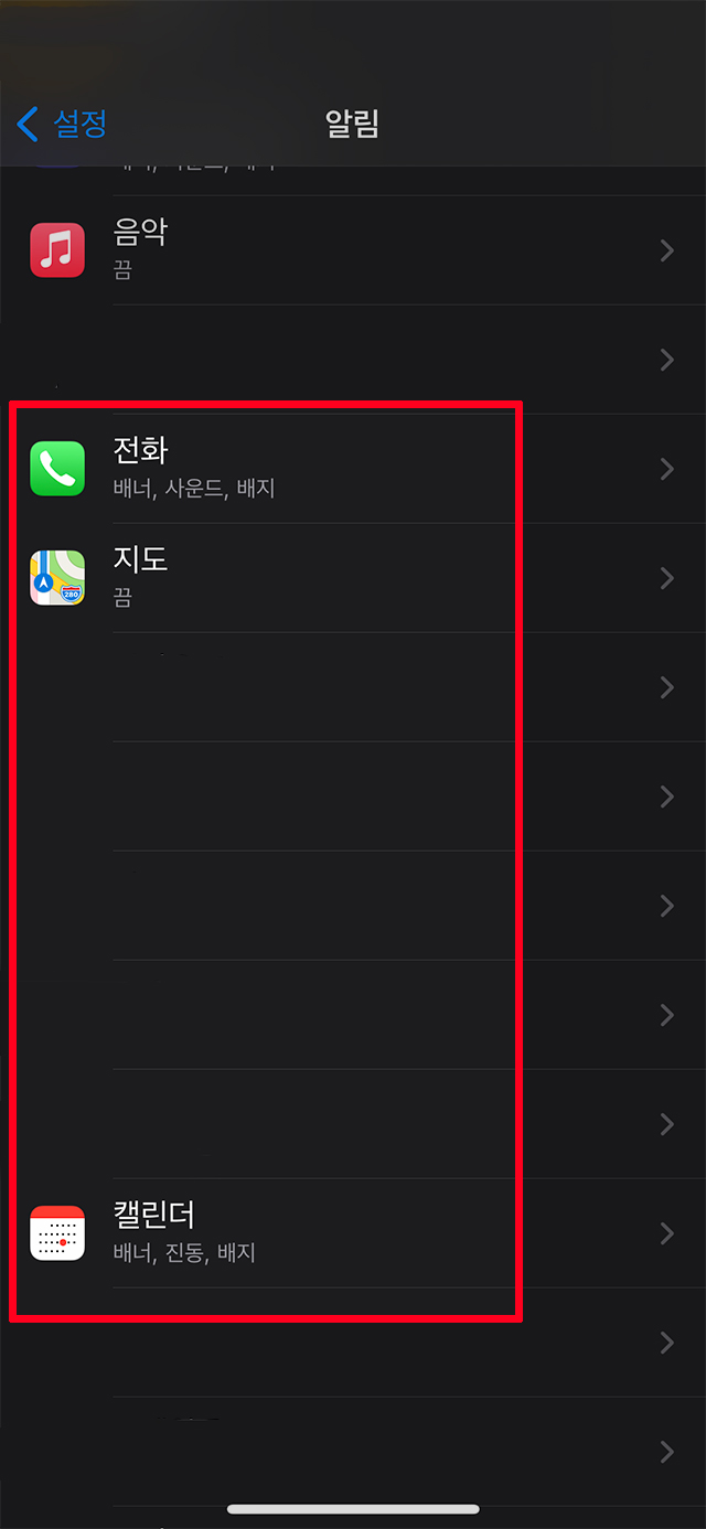 알림 설정에 표시되어 있는 현재 아이폰에 설치되어 있는 App 리스트에서 각각의 앱들 마다 조금씩은 다른 알림 설정으로 되어 있는 것을 알 수 있습니다