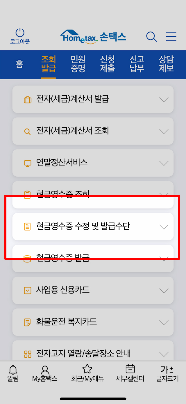 조회&발급 메뉴에 속해 있는 여러 가지 2차 메뉴 목록 중에서 <현금영수증 수정 및 발급수단> 을 찾아야 합니다