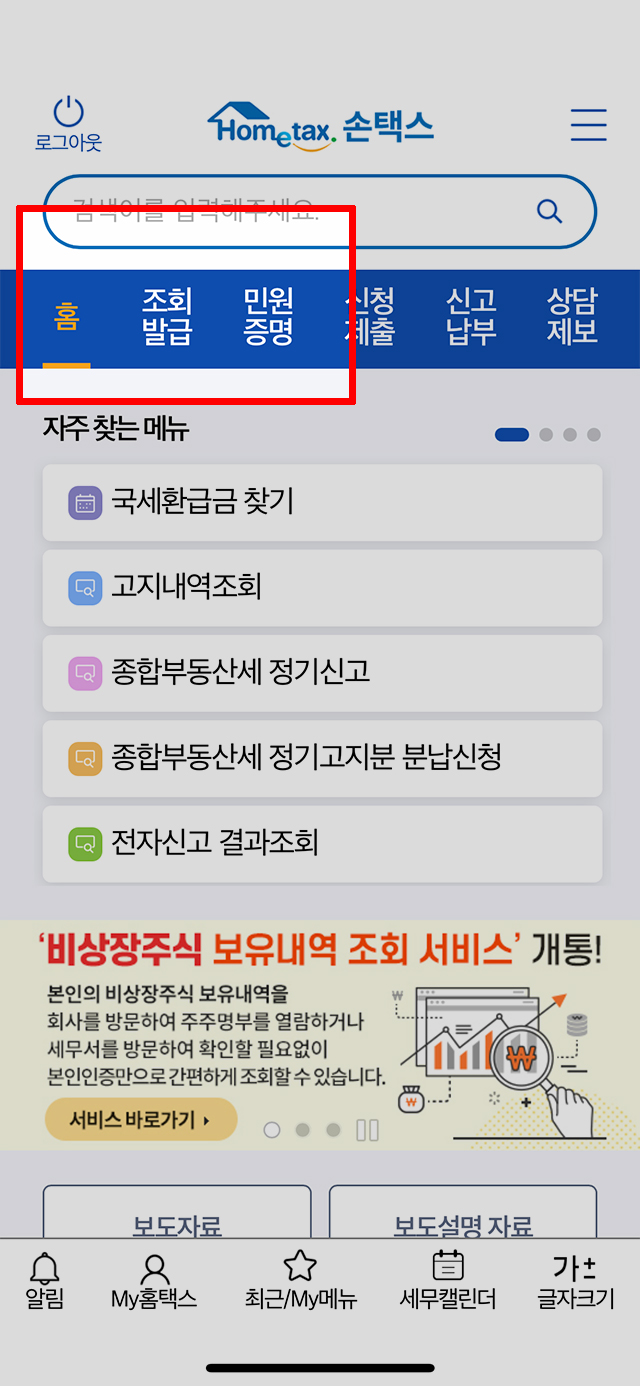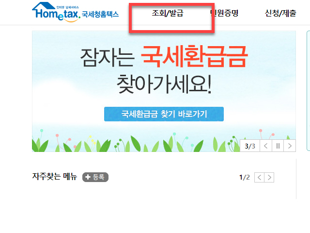 로그인을 완료했다면 Hometax 사이트의 메뉴 목록 중에서 <조회/발급> 로 마우스를 이동합니다