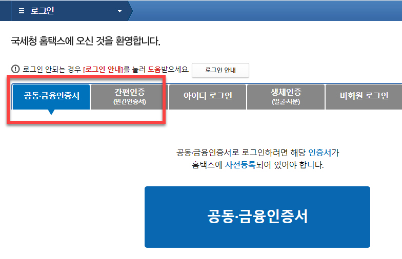 일반적으로 많이 사용하고 있는 구 공인인증서를 대체하는 <공동인증서 인증> 이나 <금융인증서 인증> 중에서 국세청 홈택스에서도 등록하여 사용하고 있는 동일한 인증서로 선택하여 진행하시면 됩니다