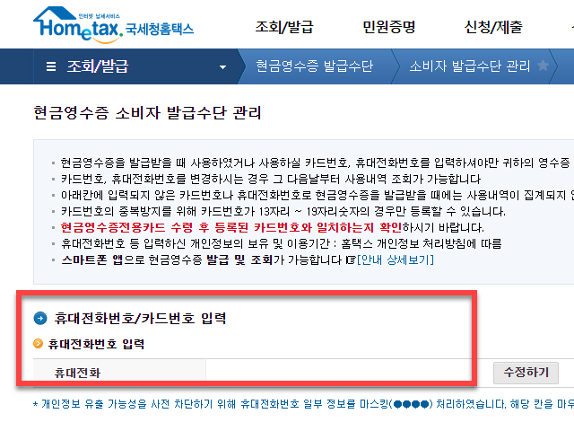 현금영수증 소비자 발급 수단 관리 페이지 영역의 상단에 있는 <휴대전화번호/카드번호 입력> 에서 입력되어 있지 않았던 <휴대전화> 를 입력 또는 수정 작업을 완료해 주시면 됩니다