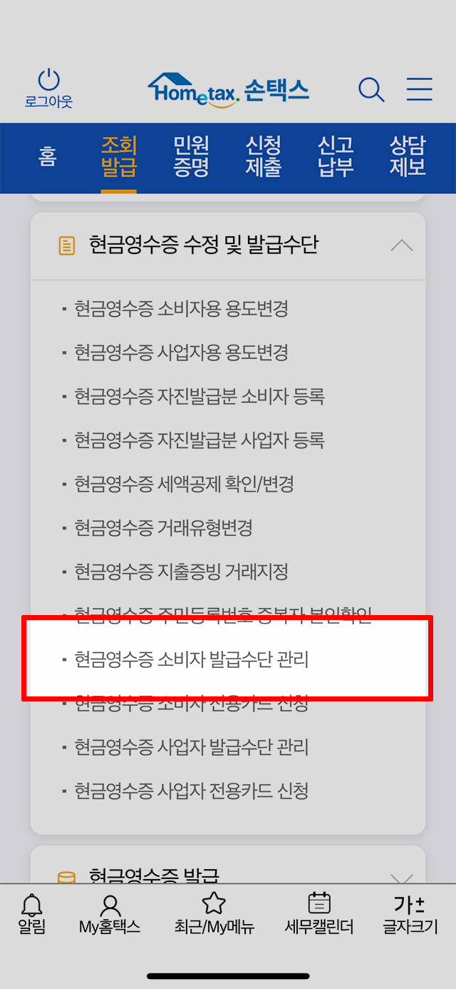 <현금영수증 발급수단> 의 항목 아래로 펼쳐지는 메뉴 중에서 <소비자 발급수단 관리> 를 선택합니다
