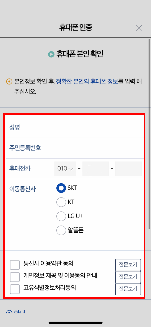 휴대폰 본인 확인 인증에서는 본인 이름과 주민등록번호 그리고 휴대폰 전화번호와 함께 사용하고 있는 이동 통신사 선택과 3개의 체크 표시가 필요한 약관 동의 작업이 추가로 필요합니다
