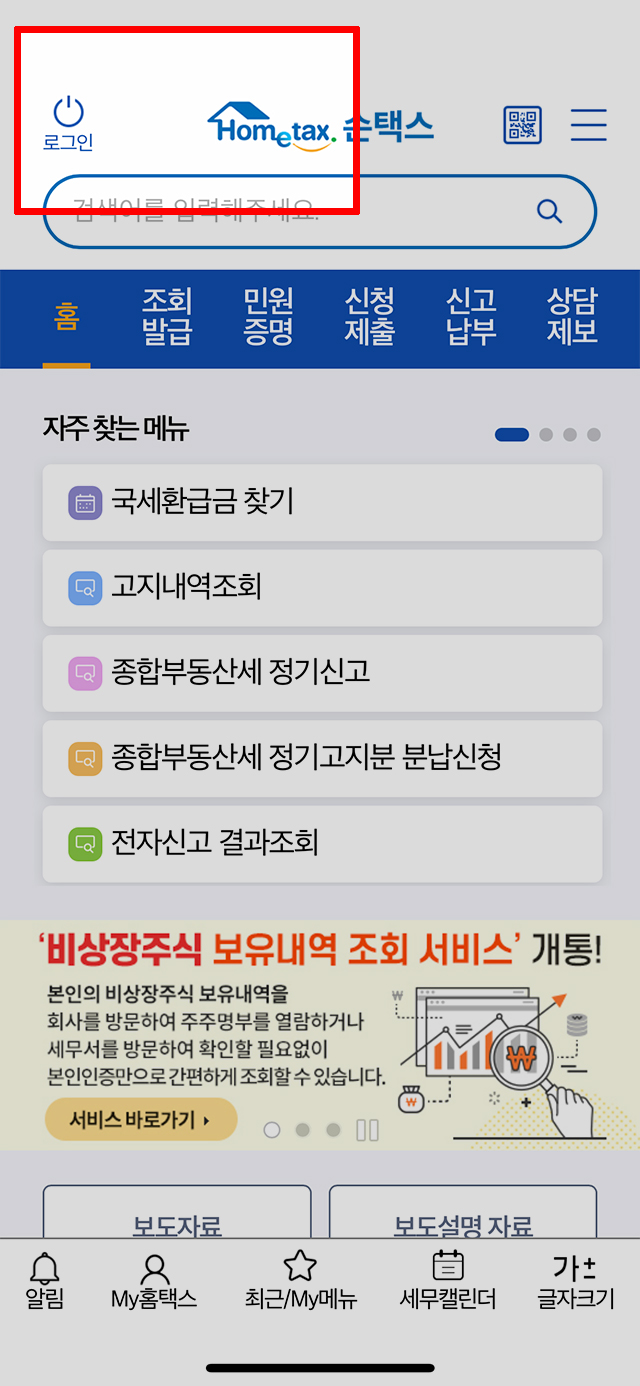 국세청 홈택스 홈페이지를 사용하기 위해서는 먼저 화면 상단에 있는 <로그인> 텍스트 링크를 클릭하여 작업을 시작해야 합니다