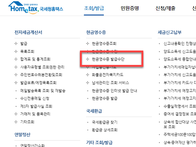선택한 조회&발급 메뉴에 해당하는 하위에 있는 전자세금계산서, 연말정산, 국세환급 항목과 함께 <현금 영수증> 영역에 포함되어 있는 <현금영수증 발급수단> 을 찾아 마우스로 클릭이 필요합니다