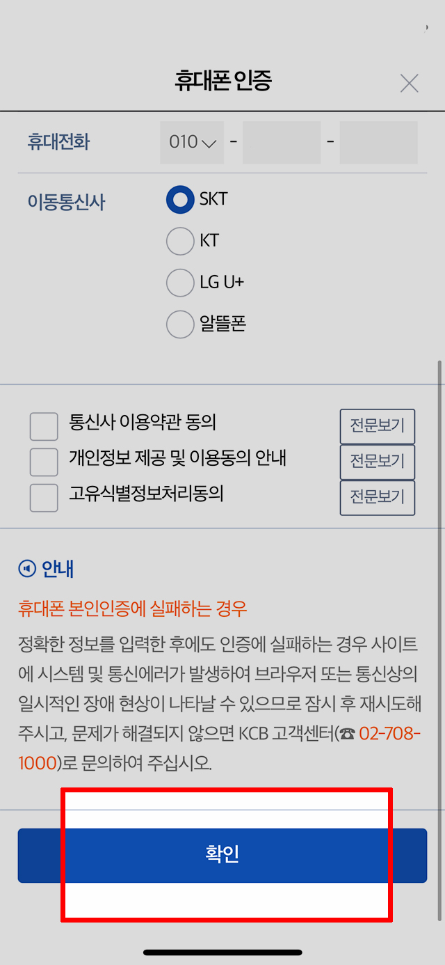 다음으로 휴대폰 인증에 필요한 정보를 기입하셨다면 화면 아래에 있는 <확인> 버튼을 선택합니다