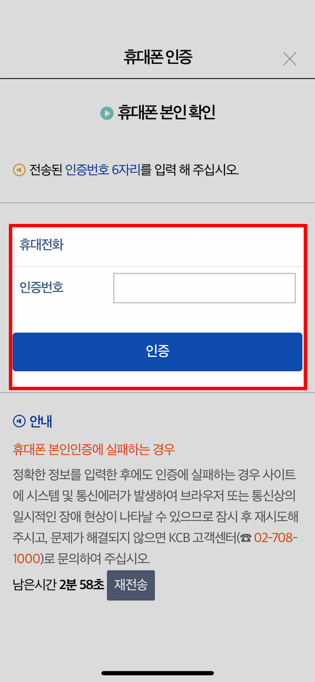 입력한 휴대전화 문자메시지함으로 전송된 인증번호 6자리를 찾아서 <인증번호> 빈칸에 틀리지 않게 조심히 입력 후 <인증> 버튼을 클릭합니다