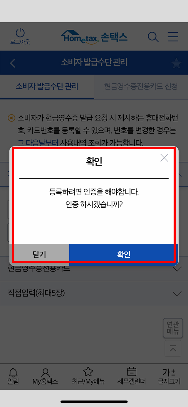 스마트폰 국세청 손택스 앱에서 현금영수증 휴대폰 번호 등록 과정