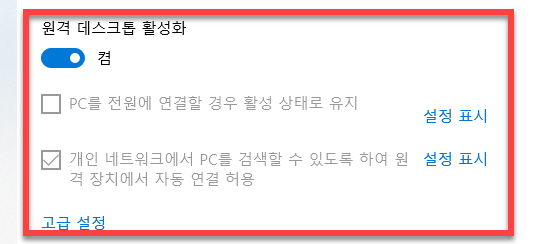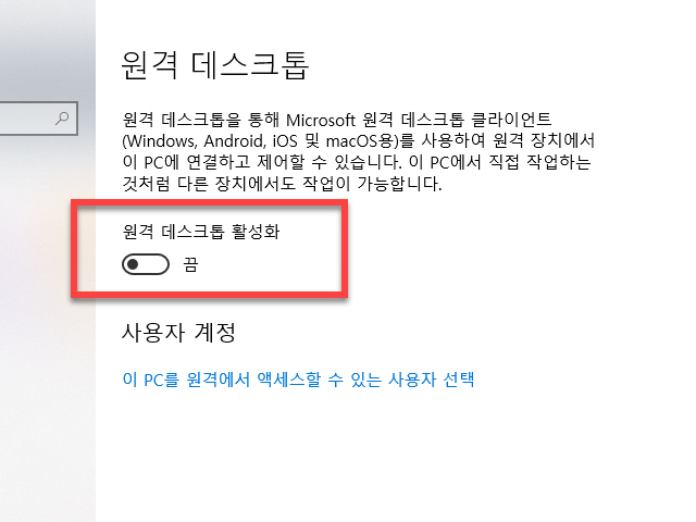 현재 컴퓨터로 원격 접속하여 들여다볼 수 있도록 비활성화 끔 상태의 (활성화 상태) 변경을 위해서 원격 데스크톱 환경설정의 <원격 데스크톱 활성화> 버튼을 클릭해 주시면 됩니다