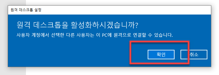 사용하고 있는 사용자 계정으로 다른 사용자가 PC에 원격으로 연결되는 설정을 활성화할지에 대해서 한번 더 확인하는 팝업 창이 표시가 됩니다