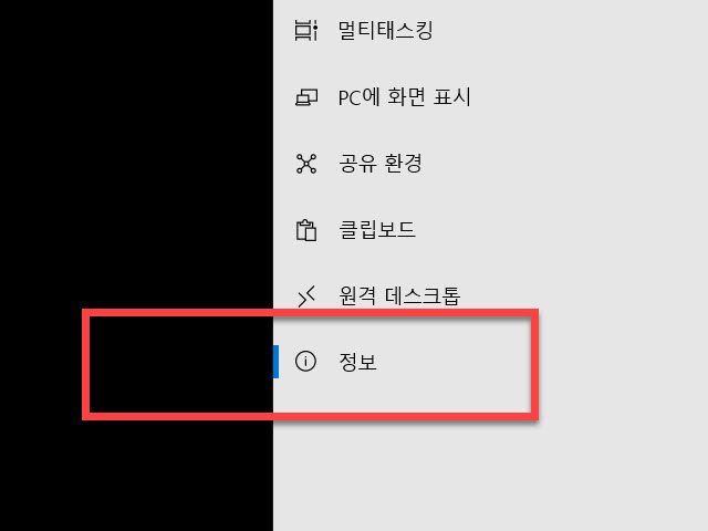 앞에서 열어 두었던 제어판 윈도우 창에 원격 데스크톱 메뉴 아래에 있는 <정보> 메뉴를 선택하여 이동이 필요합니다