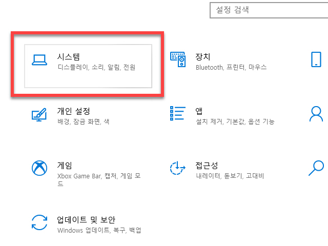 Windows 설정 윈도우 창에서 <시스템> 항목을 찾아 클릭합니다