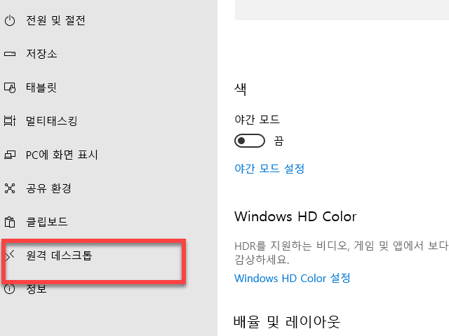 좌측에 있는 메뉴 리스트 중에서 <원격 데스크톱> 항목을 선택합니다