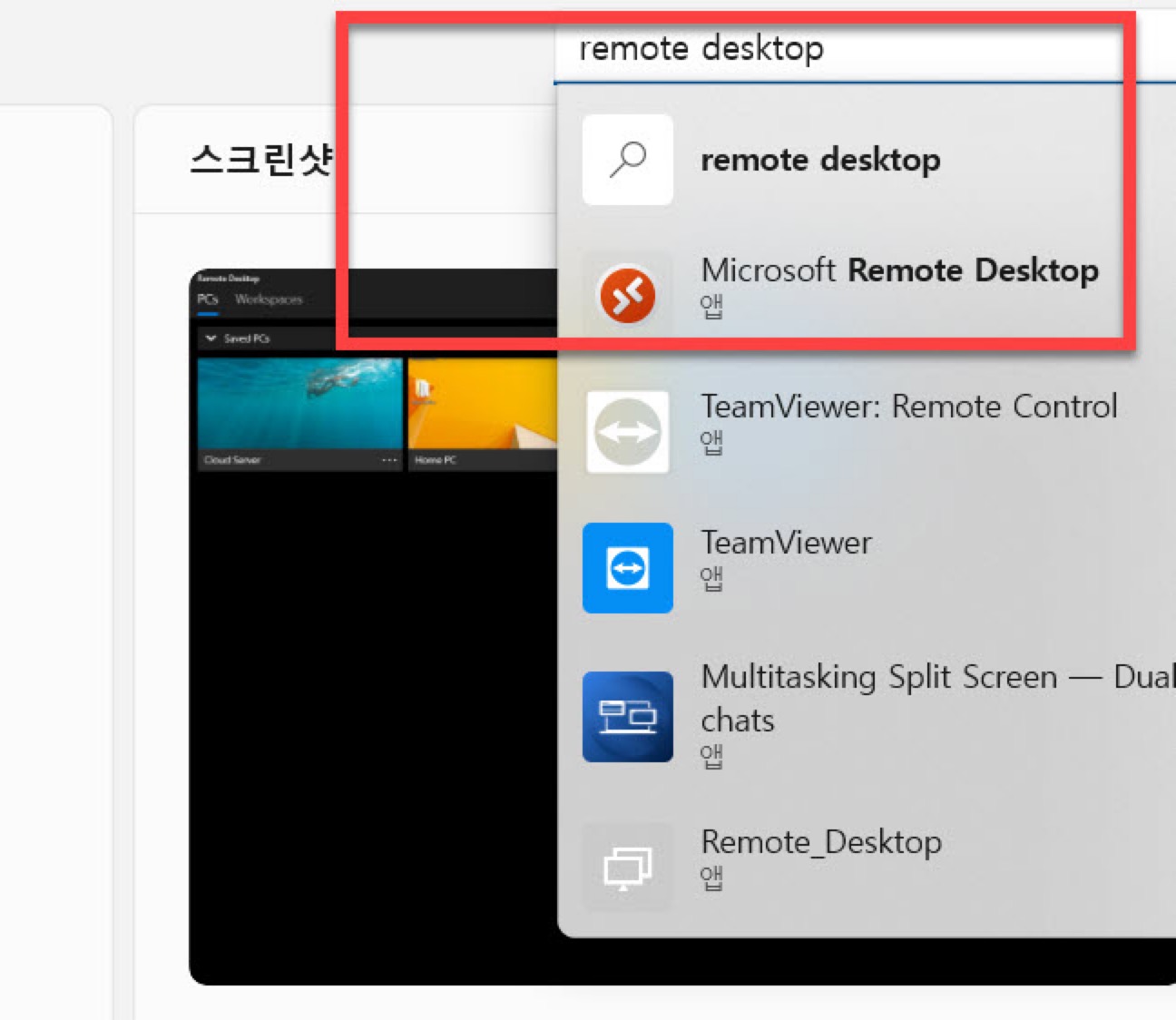 검색창에서는 <원격> 의 검색어를 입력해도 찾을 수 있습니다