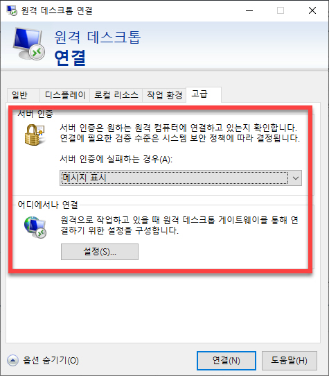 마지막에 있는 <고급> 탭에서는 서버 인증과 게이트웨이를 통한 연결 구성이 필요할 때 사용할 수 있는 설정이 위치해 있습니다