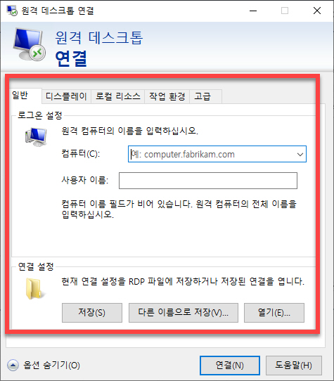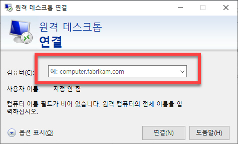 앞에서 살펴본 옵션은 그대로 유지한 상태에서 <컴퓨터 이름> 을 입력 후 <연결> 버튼을 누르면 그림과 같이 <사용자 이름> 과 <암호> 를 입력해야 하는 단계를 만나게 됩니다