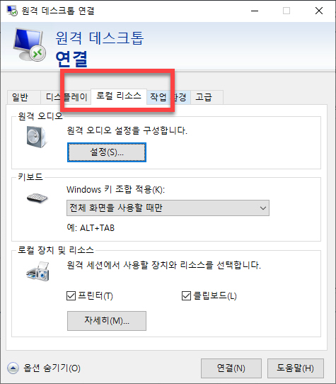 <로컬 리소스> 에서는 키보드와 원격 오디오 그리고 프린터 등의 정보도 선택, 설정이 가능합니다