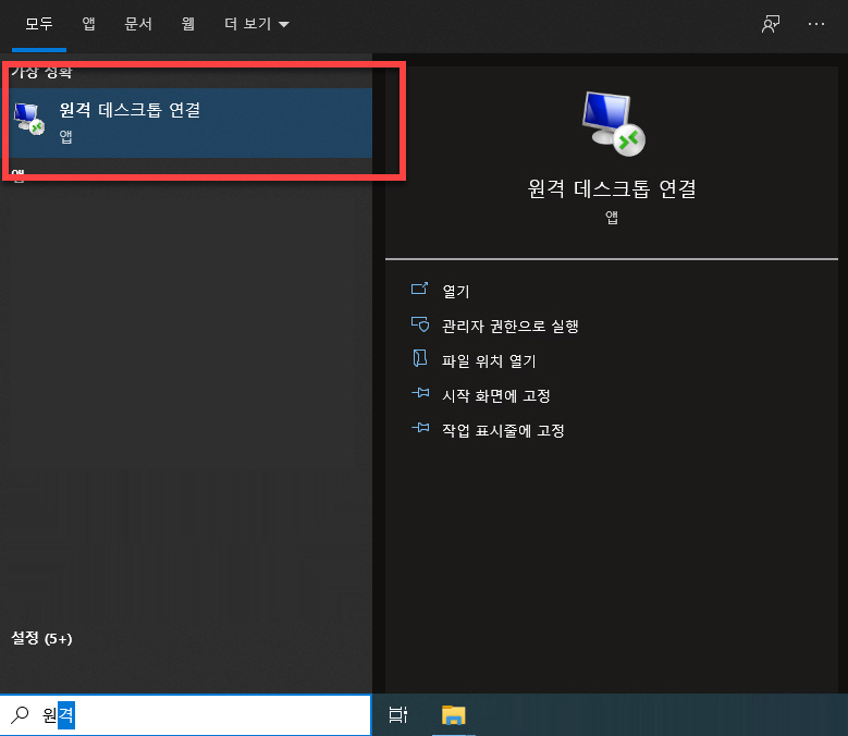 윈도우10 작업표시줄에 있는 검색창에 <원격 데스크톱 연결> 의 키워드를 입력하면 시작 메뉴에서 찾는 불편함이 없이 빠르게 찾을 수 있습니다