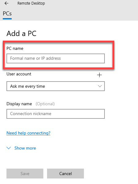 같은 인터넷 회선을 연결 사용하는 환경에서는 <PC name> 영역에는 원격 접속하려는 컴퓨터 제어판에서 확인한 <컴퓨터 장치 이름> 을 입력하시면 됩니다
