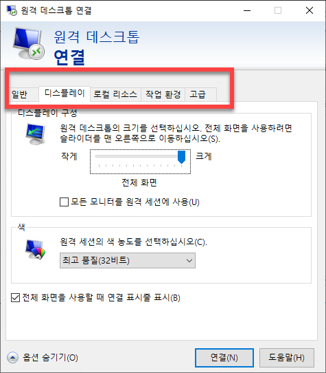 원격 접속할 PC 의 화면 크기를 변경할 수 있는 정보는 <디스플레이> 탭에서 수정할 수 있습니다