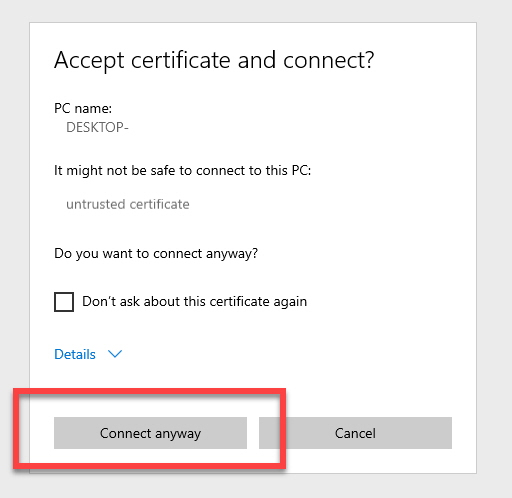 접속하려는 컴퓨터를 선택하면 그림과 같은 메시지 창이 보이면 <Connect anyway> 버튼을 누르시면 원격 접속이 시작됩니다