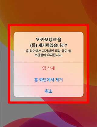이러한 경우에는 가장 빠른 해결방법으로는 아이폰에 설치되어 있는 카카오뱅크 앱 아이콘이 보이는 홈 화면으로 이동하여 해당 앱을 손가락을 <꾸욱> 누르는 작업을 해서 그림과 같은 팝업 메시지가 표시되도록 한 다음