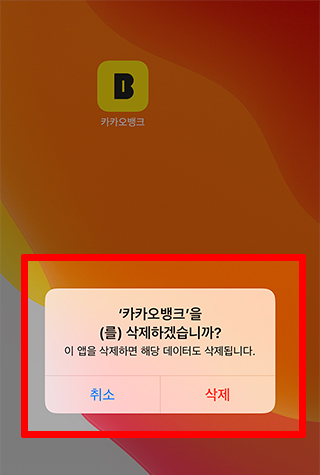 마지막으로 카카오뱅크 앱을 삭제 시 해당 데이터도 삭제가 된다는 경고 팝업창이 표시가 됩니다