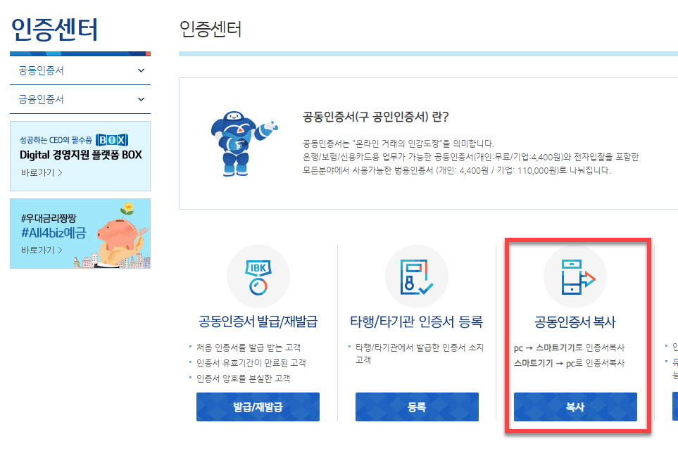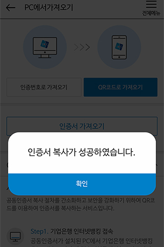 공동인증서를 스마트폰으로 복사하는 방법, IBK기업은행