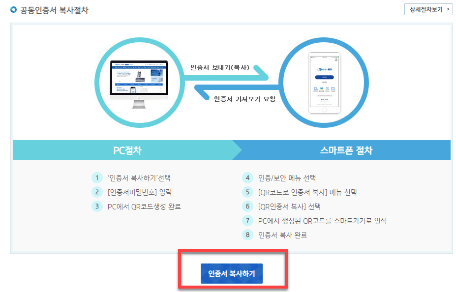 변경된 웹페이지에서 공동인증서가 있는 전자기기(컴퓨터 PC)에서 복사하려는 제품(스마트폰)을 하는 화면에서 다시 확인하셨다면,