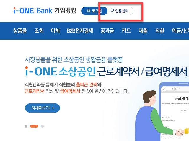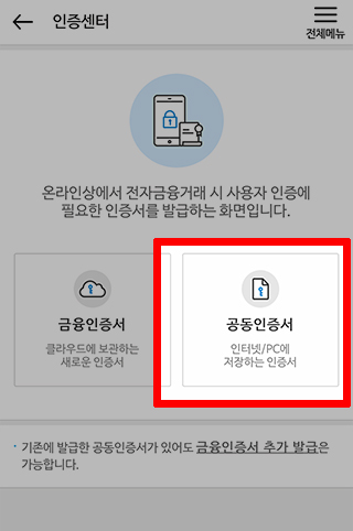 인증센터에서는 금융인증서와 공동인증서 중 이용하려는 인증서 종류를 확인 후 선택을 하시면 됩니다