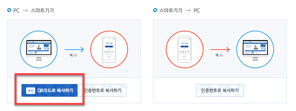 인증서 복사 작업을 간단하게 스마트폰 카메라 앱을 사용하여 복사가 되는 <QR코드로 복사하기> 와 <인증번호로 복사하기> 의 2가지 방법 중에 선택하여 진행할 수 있습니다
