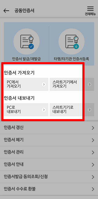 해당 메뉴는 스마트폰에 있는 공동인증서를 PC로 복사하려는 경우에도 이용하게 됩니다