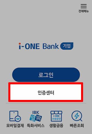 기업은행의 i-ONE Bank 모바일 뱅킹 앱을 실행하면 컴퓨터PC 에서처럼 <인증센터> 메뉴를 선택합니다