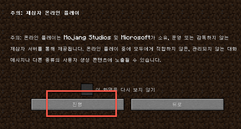 Mojang Studios 및 Microsoft 가 아닌 다른 서버를 사용하게 되면 발생할 수 있는 내용에 대해서 주의 안내 페이지를 만날 수 있습니다