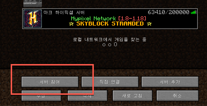 접속하려는 Hypixel Network를 선택 후 접속 프로그램 하단에 있는 <서버 참여> 버튼이 활성화 되도록 하여 버튼을 클릭하거나 서버 목록을 마우스로 더블클릭하여 마크 게임 서버에 접속을 하시면 됩니다