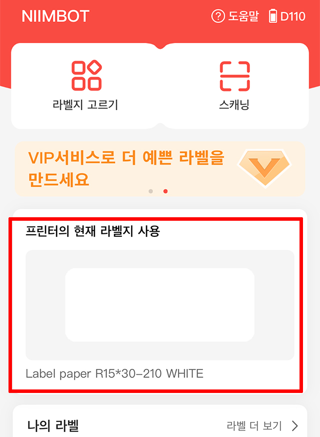 라벨 프린터에 삽입 연결한 현재 라벨 정보도 NiiMbot 앱에서 바로 확인할 수 있도록 되어 있습니다