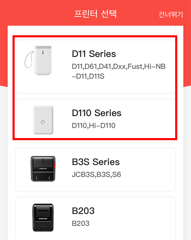 프린터 선택 화면에서는 구입하였던 제품 모델명과 사진 정보를 확인하여 선택합니다