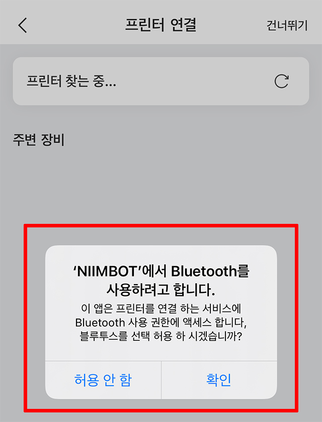 설치한 앱에서 라벨 프린터 연결 시도에 필요한 블루투스 사용권한 허용 요청 메시지가 보이면 <확인> 을 터치하여야 합니다