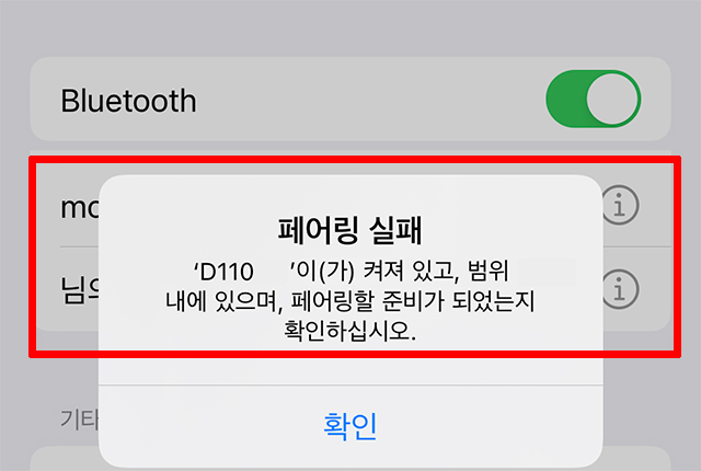 그런데 NIIMBOT 의 D110 모델의 라벨프린터는 이러한 방법으로 처음 페어링을 하면 계속해서 실패했다는 메시지가 표시가 됩니다