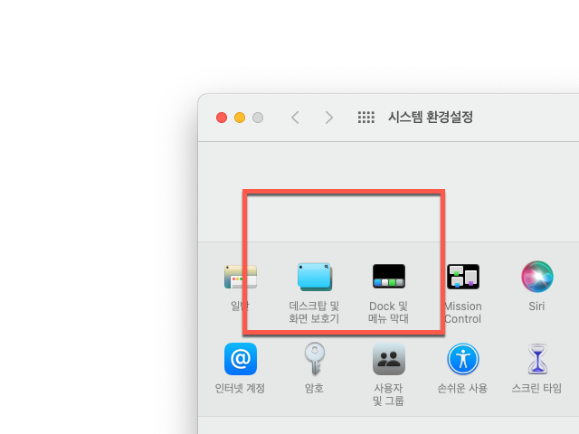 윈도우 제어판 환경설정과 같은 역할을 하는 <시스템 환경설정> 에서 <데스크탑 및 화면보호기> 를 선택하여 해당 세부 설정 윈도우로 넘어가야 합니다