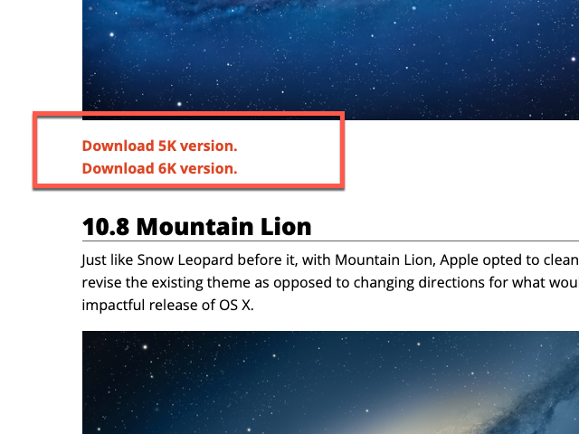 10.5 Leopard, macOS 10.7 Lion, 10.10 Yosemite, 10.12 Sierra, 10.13 High Sierra, 10.14 Mojave, macOS Big Sur 등의 Mac OS 10 버전과 Mac OS 9 버전의 5K, 6K의 고해상도 Wallpaper를 간단하게 내 컴퓨터로 받을 수 있게 되어 있습니다