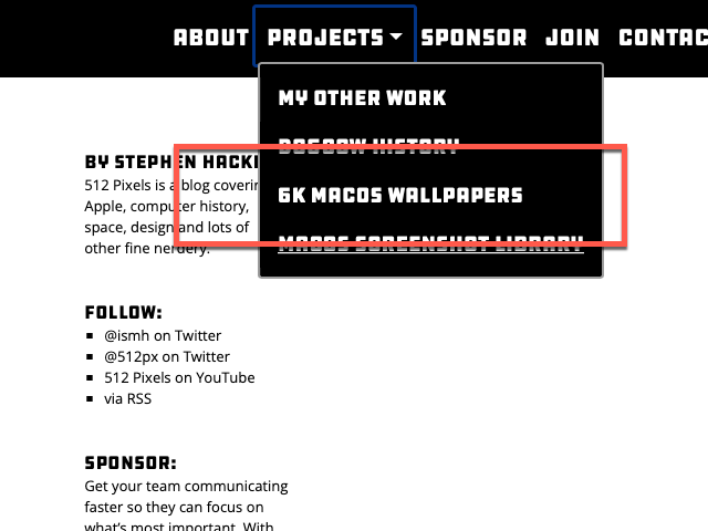 우측 상단에 있는 메뉴에 있는 <PROJECTS> 큰 메뉴 아래에 있는 <6K MACOS WALLPAPERS> 메뉴를 선택하시면 간단하게 찾을 수 있습니다
