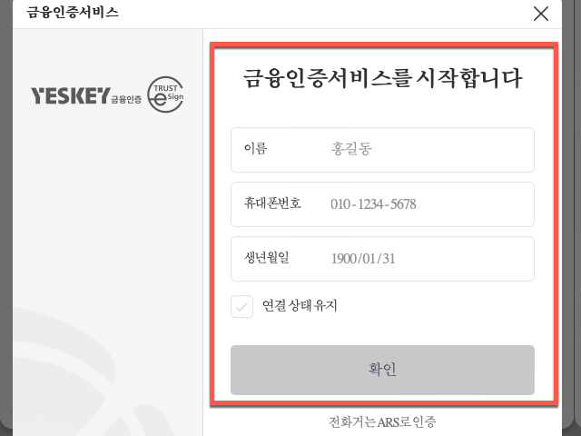 인증서 로그인 방법 중에 금융인증서를 지원하면 금융인증서를 발급&등록할 때 기입하였던 이름, 휴대폰 번호 그리고 생년월일을 그림과 같은 윈도우창에서 입력하는 간단한 과정과