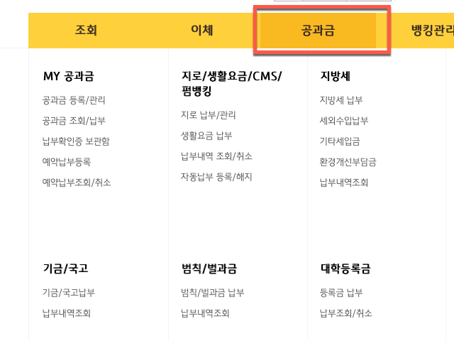 KB국민은행 사이트의 메뉴 중에 3번째에 있는 <공과금> 메뉴로 마우스 커서를 이동하면 지방세, 대학 등록금, 공과금, 범칙&벌과금 등을 납부할 때 도 찾아오는 페이지의 하위 메뉴가 표시가 됩니다
