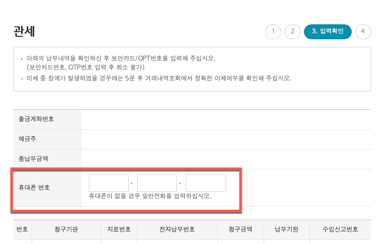출금계좌번호와 예금주, 납부하는 금액 그리고 휴대폰 전화번호 정보 확인 및 입력까지 하는 <입력확인> 의 3번째 단계에서 필요한 추가 정보를 입력해 주시면 됩니다