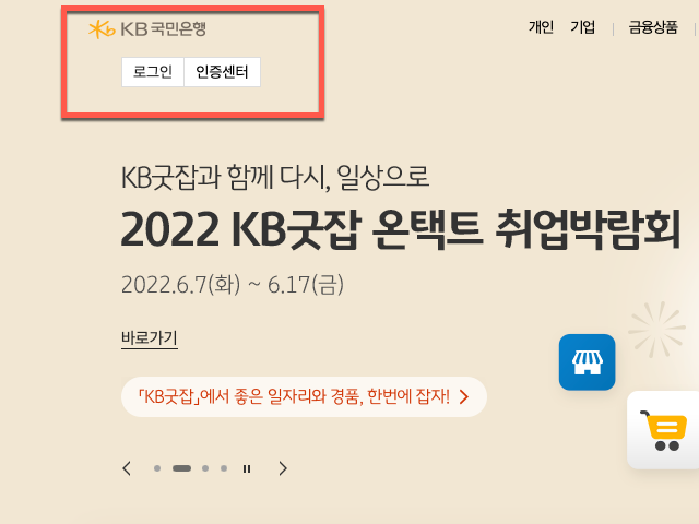 KB은행에 찾아오셨다면 좌측 상단에 있는 <인증센터> 옆에 있는 <로그인> 버튼을 클릭하시면 됩니다