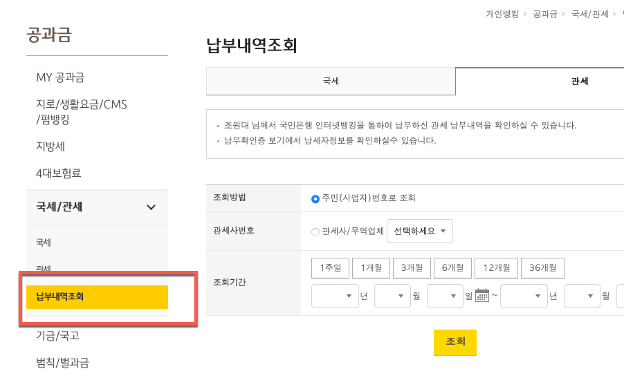 국민은행 홈페이지 관부가세 납부 메뉴 찾기