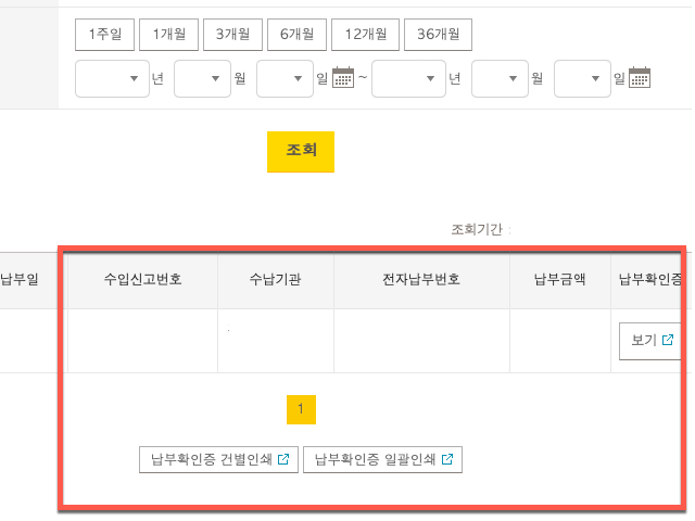 납부확인증의 컴퓨터 프린터 인쇄가 필요한 분들은 검색 기간 조회에 나와 있는 건별 or 일괄로 선택하여 출력할 수 있습니다